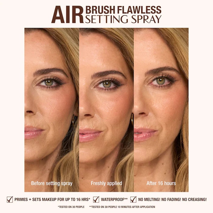 Un sellador en spray ligero y a prueba de agua para usar de prime y sellador , fijando tu maquillaje hasta más de 16 horas sin que se derrita, escurra o marque en tus líneas de expresión.
